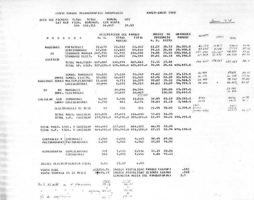 Estos datos son muy significativos. Por la dimensión del territorio objeto de estudio hay que aceptar que es una muestra totalmente representativa del sector privado del país y del sector público descentralizado. No es el momento de hacer extrapolaciones para determinar cuál sería el parque mecanográfico total. Lo haremos en otra entrega. No obstante sí puede concluirse ya la pobreza cualitativa de los instrumentos mecanográficos utilizados. El 24 por ciento –casi la cuarta parte del parque – estaba constituido por máquinas portátiles y semiestandard. Sólo el 5,3 por ciento del parque eran máquinas de escribir eléctricas. En realidad, nosotros preferíamos hablar del índice de electrificación de la escritura estándar, definido como la relación porcentual entre el número de máquinas de escribir estándar eléctricas y el total de máquinas de escribir estándar , manuales más eléctricas.. Era del 6.9 % para la totalidad del parque; de sólo el 3,8 % para Olivetti, y del 15.2 % para la competencia en su conjunto. Esta situación habría de cambiar paulatinamente en los años futuros.